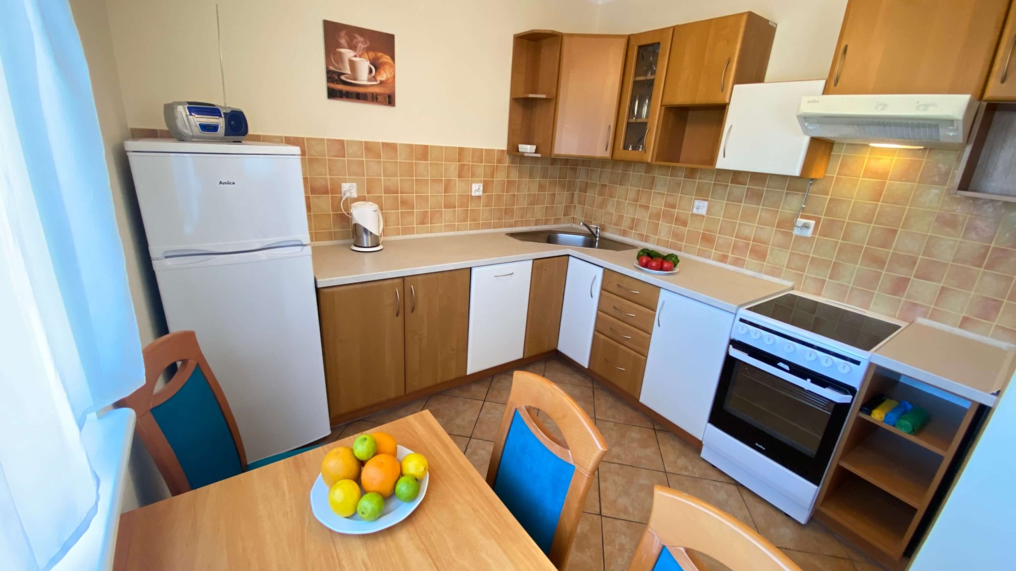 PARTER – hol wejściowy, łazienka (WC + natrysk), kuchnia: duża lodówka z zamrażarką, mikrofalówka, zmywarka, kuchenka elektr. z piekarnikiem, komplet garnków i patelni, czajnik elektr., przybory kuchenne, naczynia i sztućce, stół + 6 krzeseł, salon: otwarty kominek, rozkładana wersalka, dwa fotele, telewizor LCD 32 cale – TV cyfrowe kanały naziemne, radio.